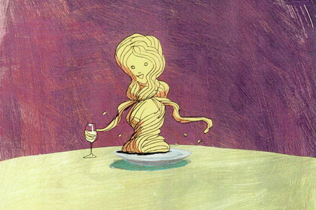 Un restaurant ouvre pour la soirée. Parmi les clients : un homme dîne seul et commande une assiette de spaghettis qui devient sa compagne de table ; un couple, dont la femme parle sans arrêt (et de façon incompréhensible), tandis que sa tête prend toutes sortes de formes. Son compagnon, affamé, refuse de payer, et le restaurant reprend sa nourriture. Une famille avec deux enfants joue, de manière assez élaborée, avec son repas.