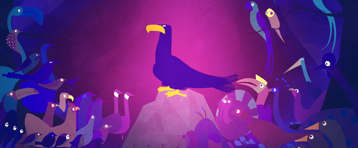 Les oiseaux se réunissent pour choisir leur roi. L’aigle se présente, avec sa grosse voix et sa stature imposante : il paraît évident que c’est à lui de régner. C'est alors qu’un tout petit oiseau, fort audacieux, clame de sa toute petite voix qu’il pourrait très bien être souverain lui aussi…