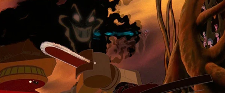 Mais là où FernGully se montre assez subtil, c’est qu’il échappe à tout manichéisme en nous montrant que les hommes chargés de couper des arbres ne sont pas des méchants. Certains sont bêtes (davantage pour l’humour que pour le message), mais ils sont tous des ouvriers qui font leur travail. D’ailleurs, la menace n’est pas humaine, elle prend la forme de l’Hexus, une entité maléfique qui se nourrit de la pollution. Une jolie idée qui se traduit visuellement par des scènes juste assez effrayantes pour être marquantes, et donne au film un méchant extrêmement réussi, qui nous fera toutefois déconseiller ce film à des enfants de moins de 8 ans. C’est aussi une jolie idée dans la mesure où elle permet d’illustrer que parfois, l’homme n’est pas directement responsable. Ici, ce n’est pas sa malveillance qui crée des catastrophes, mais sa négligence (l’arbre magique qui libère l’Hexus est coupé par erreur). Message rendu plus fort par l’absence de méchants humains : parfois, l’Homme ne détruit pas la nature intentionnellement. Parfois, il ne se rend simplement pas compte des conséquences néfastes de ses agissements…