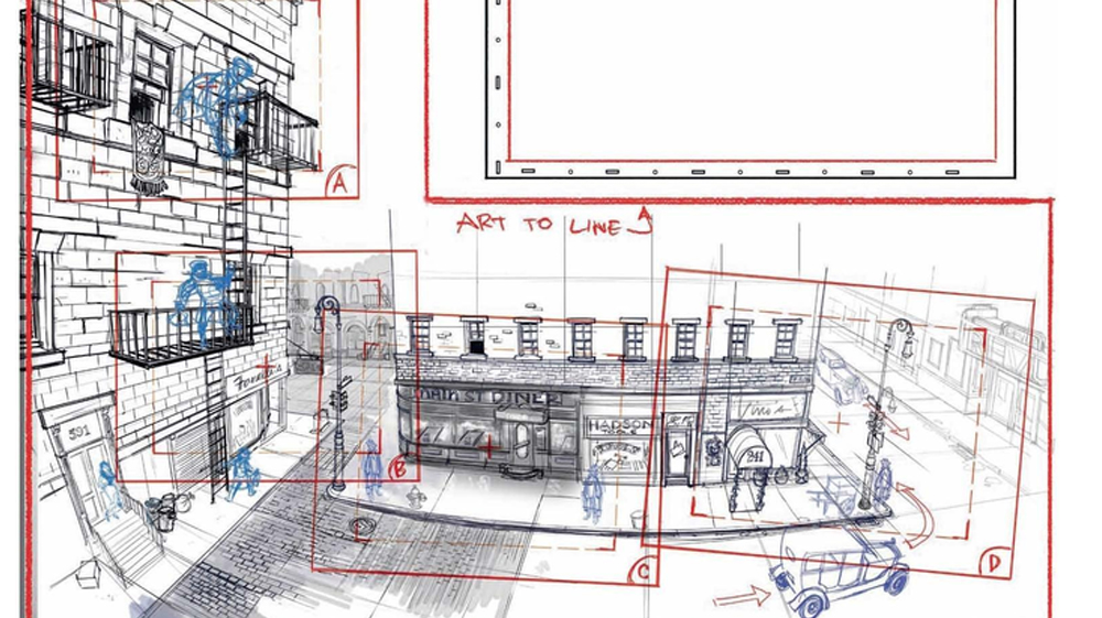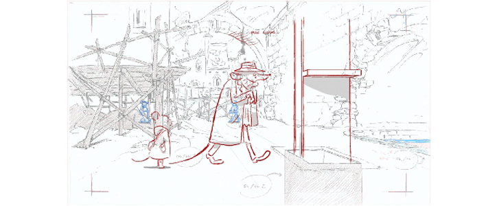 Le layout artist traduit les intentions du storyboard en une image claire et construite. Il détermine l’angle de vue, la perspective, ainsi que la place des personnages dans le décor. Ce travail permet de poser les bases du plan, en assurant sa lisibilité et sa cohérence avec la mise en scène globale du film.