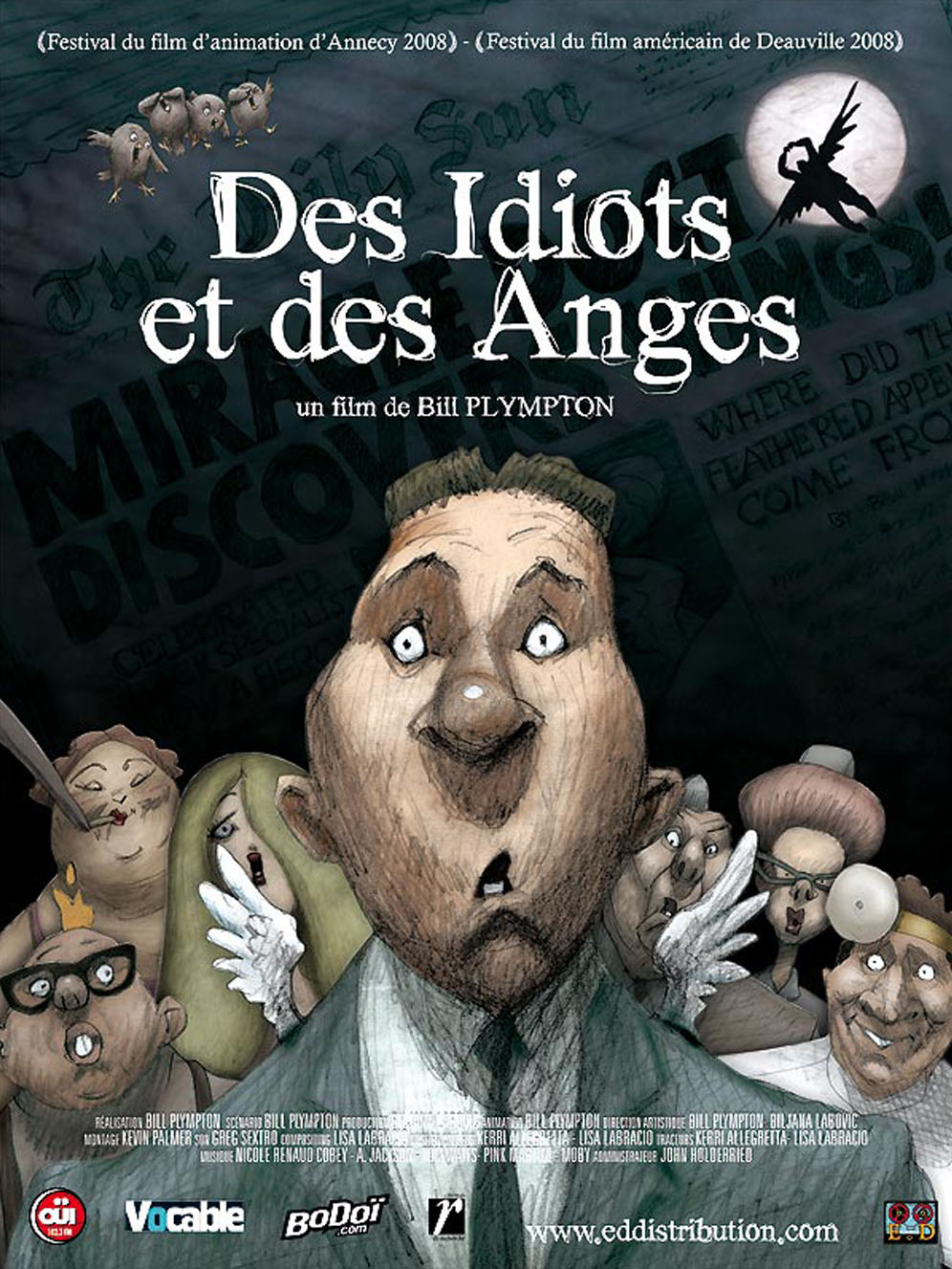 Des idiots et des anges est un film réalisé par Bill Plympton, dans lequel un homme se réveille un beau matin avec des ailes sur son dos. Le film s'inscrit dans la lignée de ce que Plympton a réalisé par le passé, mais se distingue tout de même par une définition un peu plus sombre.