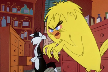 Grosminet dort sur le rebord à l’extérieur du bureau du docteur Jekyll, qui boit la potion le transformant en monstre. Grosminet poursuit Titi alors qu’il vole, et ce dernier finit par tomber dans la formule Hyde, ce qui le transforme en géant.