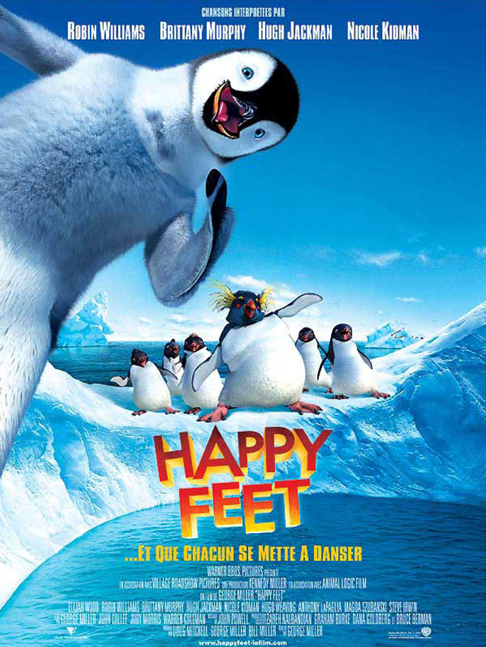 Happy Feet est un film américano-australien réalisé par George Miller. Mumble, un jeune manchot empereur, est né avec un don extraordinaire : la danse. Mais dans son monde, où les manchots doivent chanter pour trouver l'amour, son talent est considéré comme un défaut. Rejeté par sa communauté, Mumble se lance dans un voyage extraordinaire qui le mènera à la découverte de lui-même et à la rencontre d'un groupe de manchots rebelles.