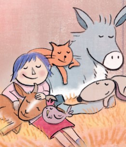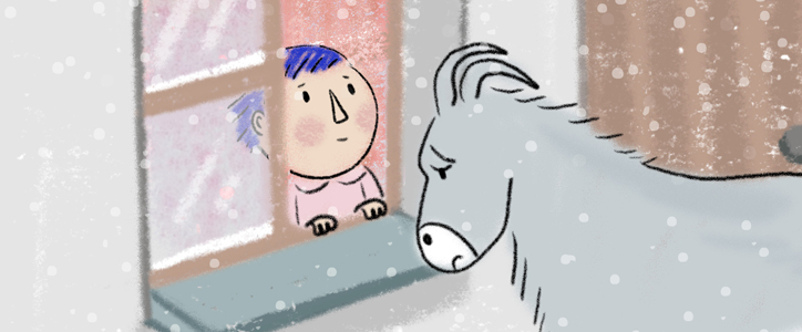 Noëlle décore son sapin, quand elle entend frapper à la fenêtre. C’est un chat qui veut s’abriter car il neige dehors. Pour l’aider, Noëlle l’invite à aller se réfugier dans leur grange. Peu après, on frappe de nouveau à la fenêtre…