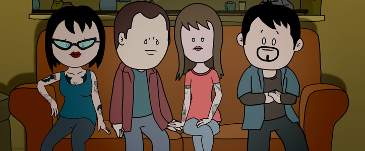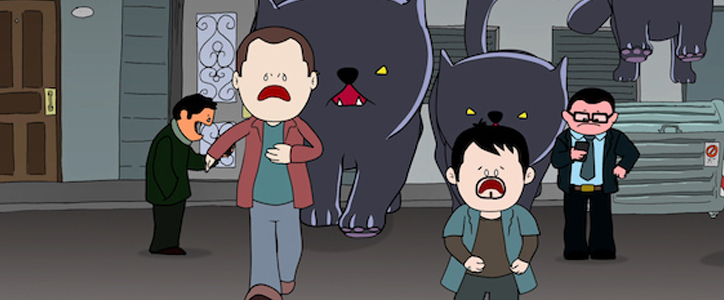Une animation minimaliste mais pensée. Elle est fluide et douce jusque dans les mouvements de cheveux. L’apparente simplicité de l’animation ne nuit pas au character design, suffisamment expressif et coloré pour créer une galerie de personnages variés. Le style caricatural entre en résonance avec la dimension satirique de l’œuvre, et cela grâce à un choix audacieux de reprendre les codes des animations Flash des années 2000. Une esthétique historiquement liée à un Internet libre et un humour des plus absurdes. Influence qui est également cohérente avec le propos du film sur les médias et la surveillance. Effectivement, le film critique le contrôle social par les médias tout en mettant en abyme le pouvoir résistant de l’art, à la fois à travers l’intrigue (la série prémonitoire) et par sa forme même, l’art de l’animation. On pourrait aussi souligner l’aspect visuel rudimentaire comme outil pour détourner l’attention du « spectaculaire » et ainsi mieux servir le message du film : faire réfléchir plutôt qu’émerveiller.