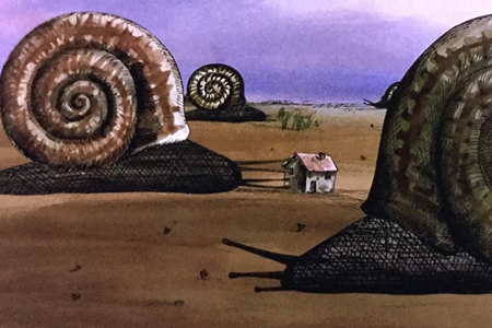 Les Escargots, court métrage de René Laloux sorti en 1966 est réalisé sur des dessins de Roland Topor. À travers une colorimétrie assez chaude appliquée à un ciel blanc, presque jauni (ce qui crée une impression de ciel nuageux en accord avec l’ambiance du court), Laloux raconte l’histoire d’un homme qui souhaite désespérément faire pousser ses plantations, avant de se faire envahir par des escargots géants. L'intrigue est ingénieuse et amusante, les dessins, très détaillés avec des ombres et des couleurs que Laloux a harmonisées avec le tout, sont charmants, et l'animation en collage d'éléments découpés donne un univers plastique très créatif. Cependant, le choix de la bande sonore ne suit pas toujours les événements de l'histoire.