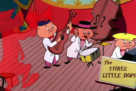 Les Trois Petits Bip-bops revisite le conte des Trois Petits Cochons à la sauce jazz, avec une narration entièrement chantée et rythmée par une bande-son bebop endiablée. Le loup, recalé du groupe des cochons musiciens, tente de se venger à coups de dynamite et de grosses caisses, mais finit toujours par être recalé… jusqu’à sa chute finale, littéralement infernale. L'originalité du style musical, l'absence de dialogues parlés et le graphisme stylisé donnent au film une ambiance unique. Un exercice de style musical réussi, même si l'humour passe ici au second plan.