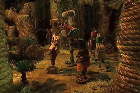 The Legend of the Sky Kingdom est doté d’une narration claire et linéaire, qui reste pourtant très immersive grâce à la gestion de ses dialogues, à la personnalité lumineuse de ses personnages et à sa bande sonore. Le récit démarre dans un bidonville, dans des conditions désastreuses pour nos trois orphelins qui rêvent de rejoindre le paradis dont ils ont entendu parler. L’objectif est simple et immédiatement prenant. Dès les premières minutes, on veut que nos héros s’en sortent. L’univers, lui, est franchement étonnant. Il réussit avec brio à mêler misère urbaine et imaginaire lumineux, un défaut de production transformé en avantage pour le récit. Le chara-design est très inventif : les personnages sont faits de babioles, d’objets trouvés, de détritus, mais ils restent colorés et amusants à regarder malgré l’environnement hostile qui nous est présenté autour. Cette esthétique est d’ailleurs cohérente avec la direction artistique et l’intrigue dans leur globalité.