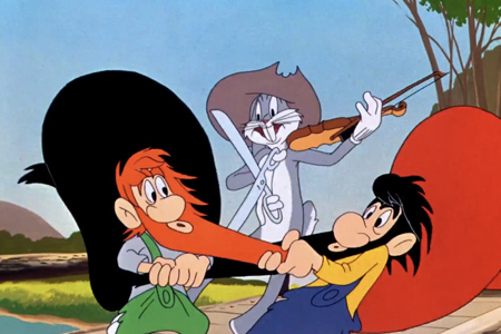 Venez guincher chez Bunny de Robert McKimson voit Bugs Bunny affronter deux frères montagnards aussi bornés que malchanceux, dans une série de gags menant à une danse carrée délirante. Le court fonctionne par son rythme effréné et son humour absurde, typique de l’âge d’or de Warner Bros. La séquence finale, où Bugs orchestre la danse au violon, reste un morceau d’anthologie du slapstick. Mais derrière cette virtuosité, tout repose sur une mécanique comique désormais prévisible : le lapin rusé, les idiots dupés, et la surenchère de gags.