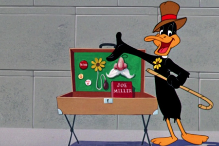 Daffy Duck est un vendeur de gag de nouveauté opérant sur le trottoir d'une grande ville, colportant futilement des choses comme des écureuils de fleurs, un livre de blagues de Joe Miller, un rib-tickler, un badge d'inspecteur de poulet et un buzzer électrique de 200 volts, démontrant par inadvertance ce dernier sur lui-même.