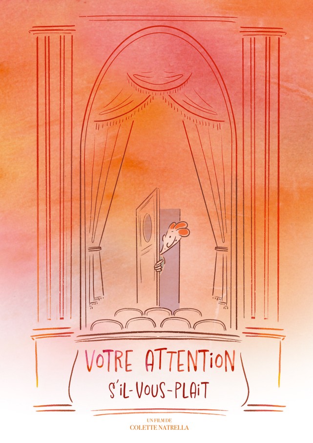 Réalisé en 2024 par Colette Natrella, Votre attention s’il vous plaît observe avec légèreté les comportements d’un public avant une représentation. À la manière d’un Sempé, le dessin minimaliste capte les détails du quotidien avec humour et une certaine tendresse. Le film s’adresse à tous, sans prétention, mais laisse peu de traces une fois terminé.